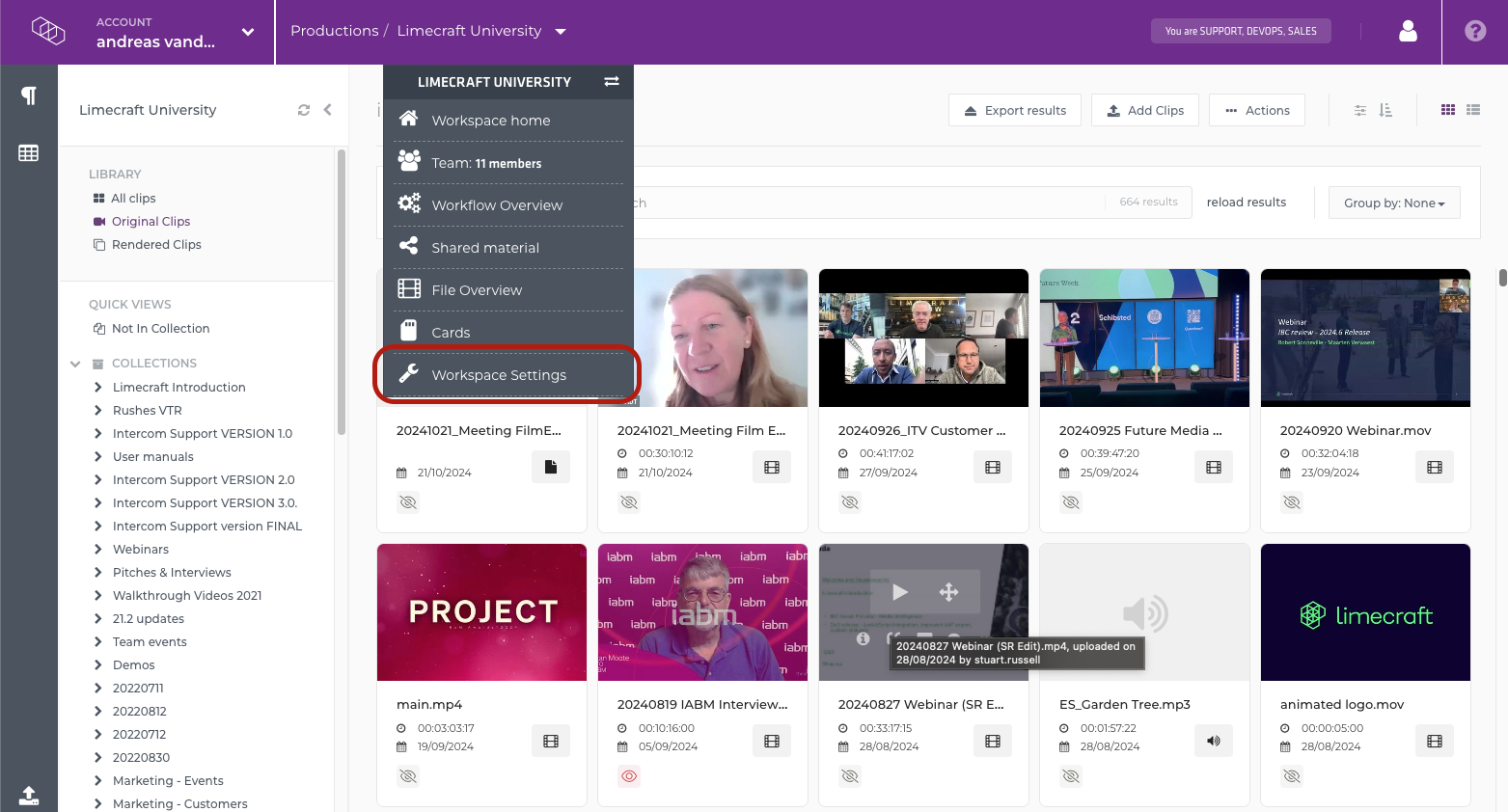 In your capacity as Account Manager or Production Manager, Workspace Settings are accessible via the drop down menu in the top navigation.