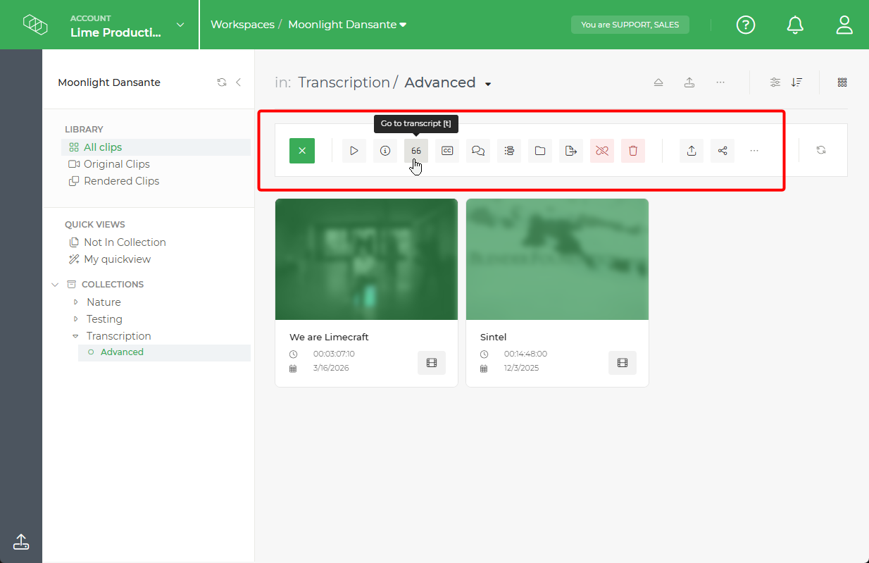 Limecraft screenshot showing how to start a transcription job