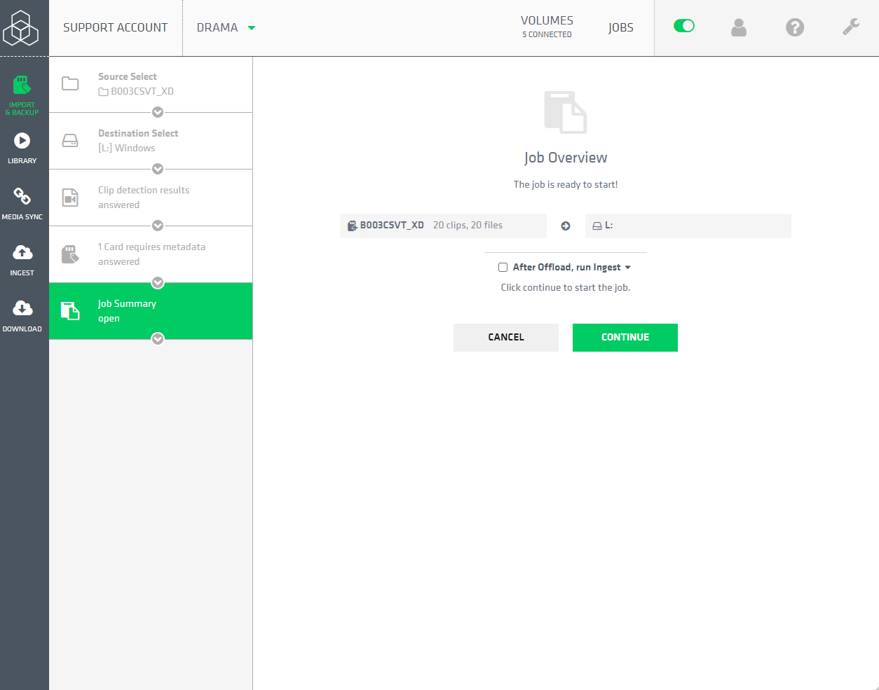 In the Import & Backup tab, select one or more sources to back up, then click Continue. Often there is only one source as the camera cards are offloaded one by one.