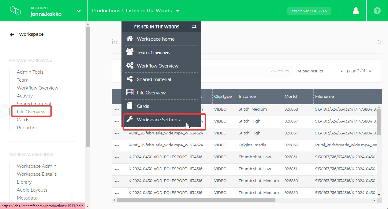 The File Overview provides detailed information about all file instances within a specific Limecraft Workspace. You can use filters and column settings to drill down to the details you need. Explore clip details or material data using the action buttons.