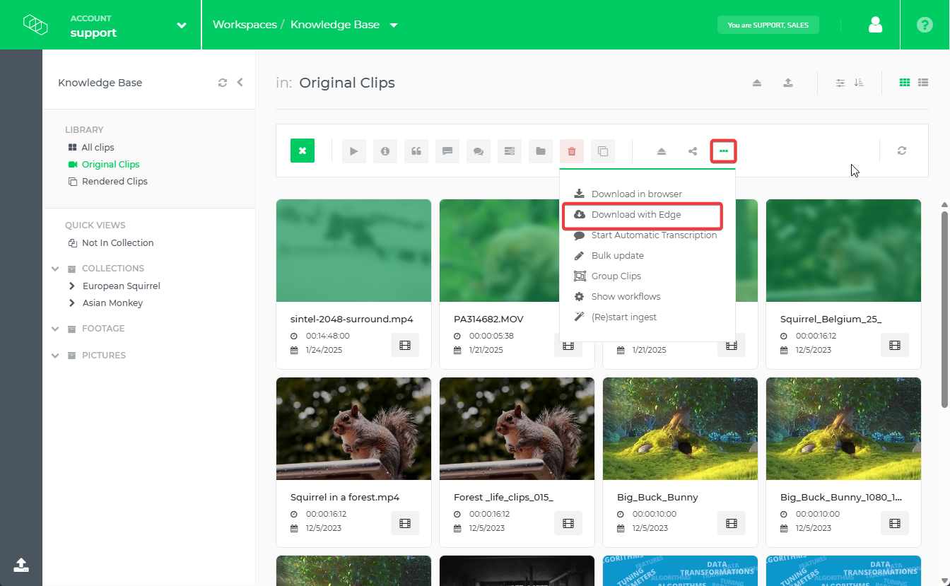 - Start the download – Click on the ellipsis (...) next to a clip or use the Download option in the upper toolbar.